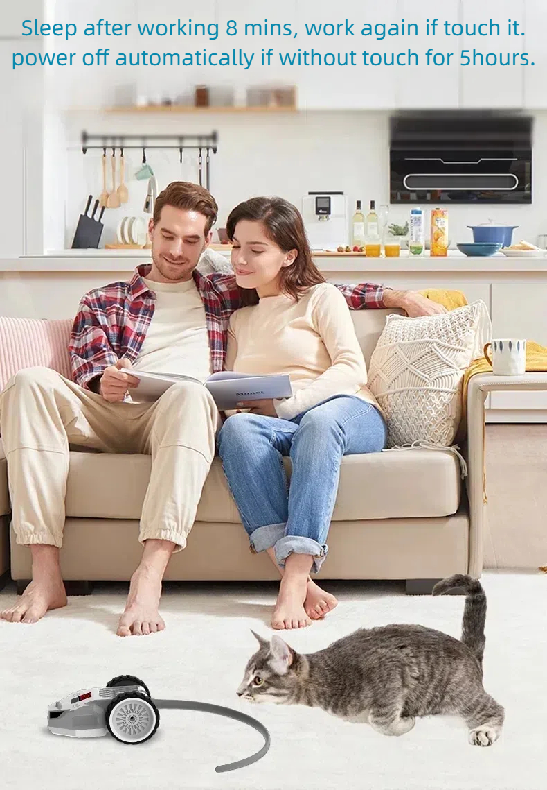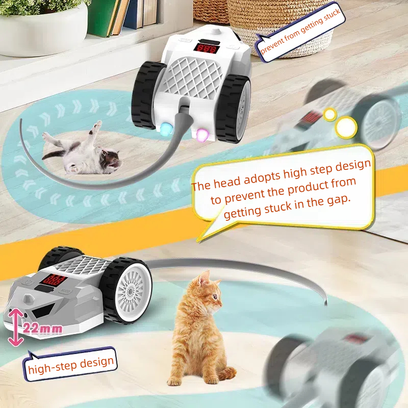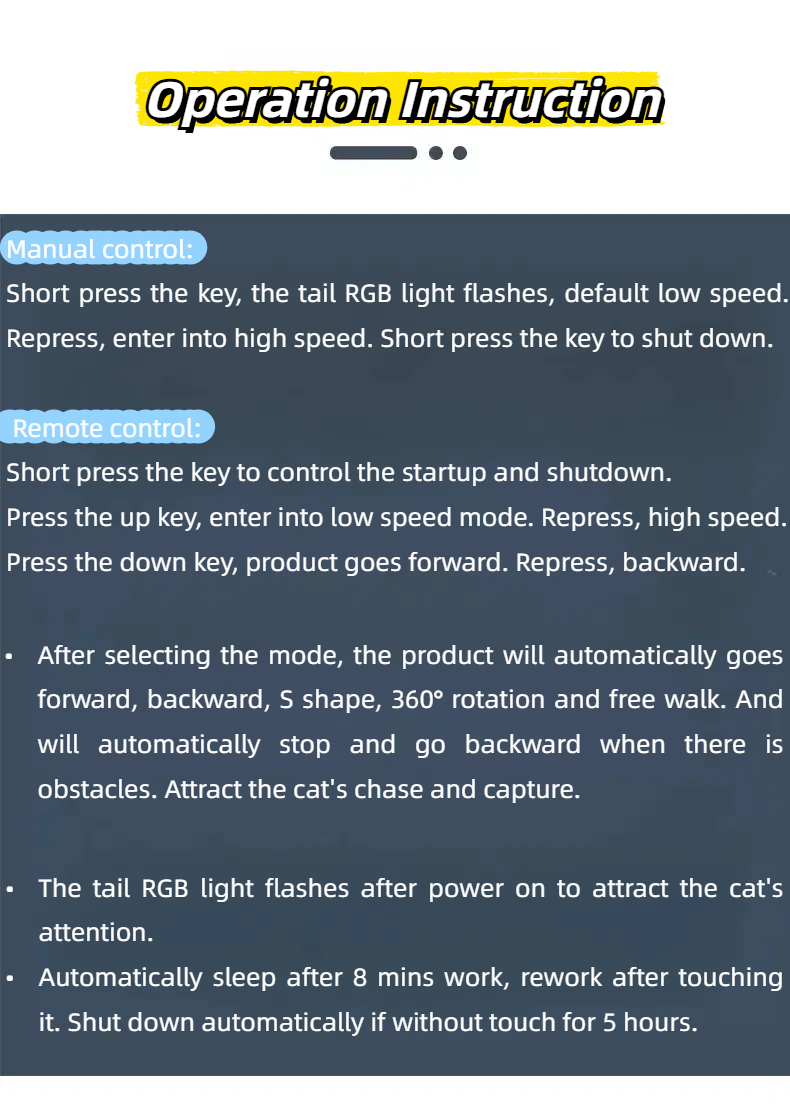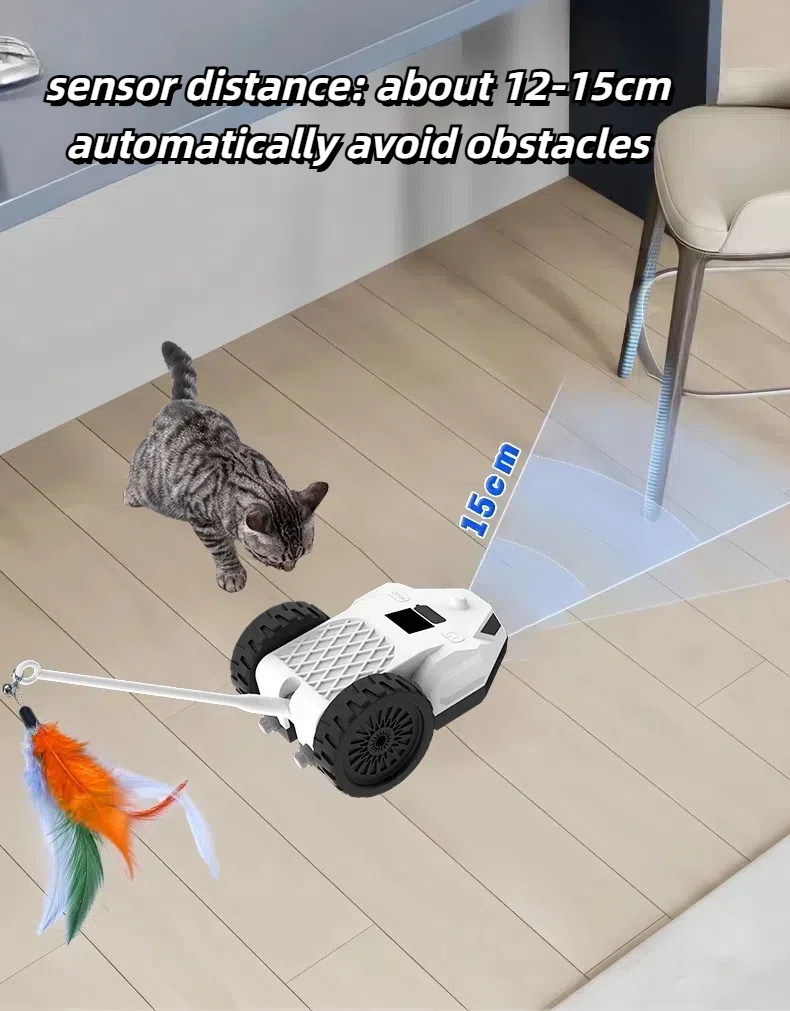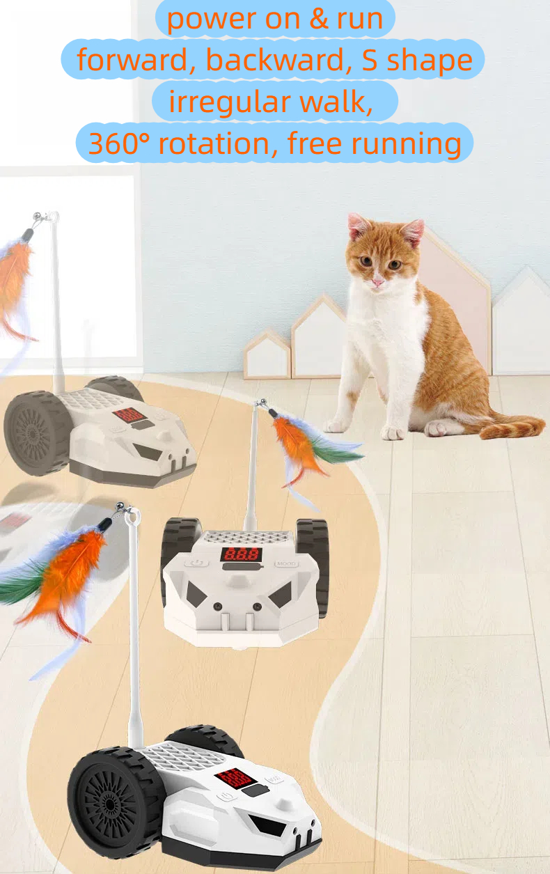 Features: The tail part of the product can be changed into a metal rod feather tickle stick, a plastic rod feather tickle stick, and a silicone tail according to the cat's preferences. The RGB light flickers, the speed is adjustable, the S-shaped moving attracts the cat to chase, automatically avoids obstacles, the remote control + manual dual control.