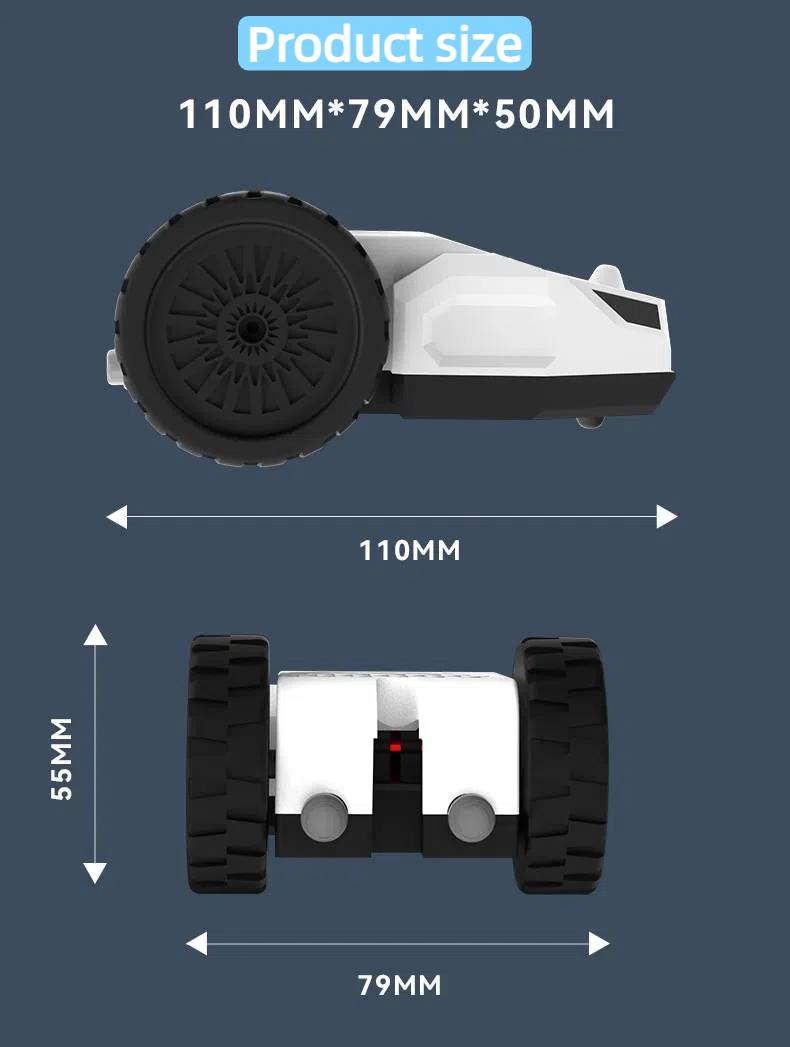 Functions: 1. Automatically forward and backward after the boot, 2. The tail RGB light flashes, 3. Irregular S-shaped moving & 360° rotation, 4. With induction to avoid obstacles, 5. Speed can be adjusted, manual and remote control, 6. Sleep after working 8 mins, work again by touching the product. |
