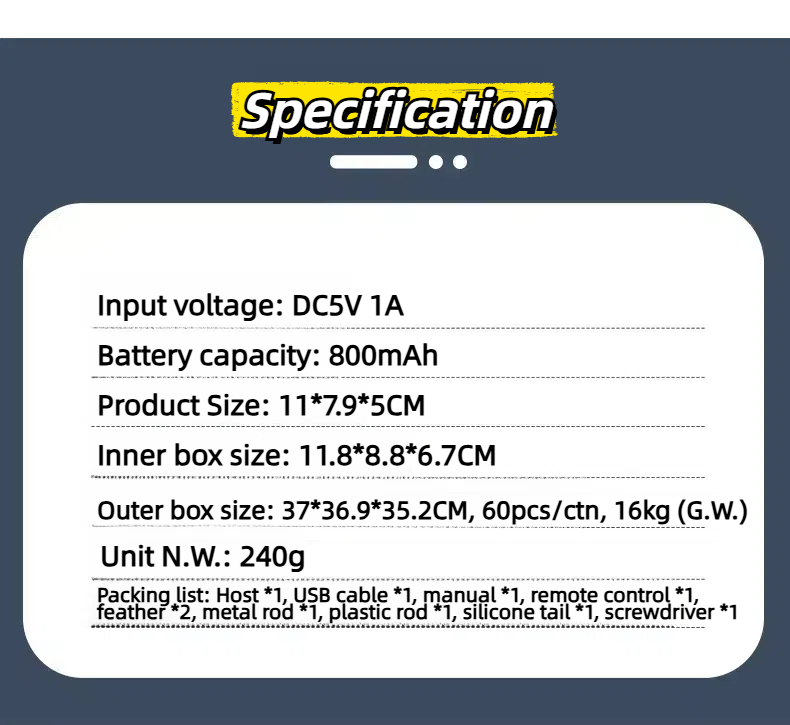 Packing list: Host *1, USB cable *1, manual *1, remote control *1, feather *2, metal rod *1, plastic rod *1, silicone tail *1, screwdriver *1 |