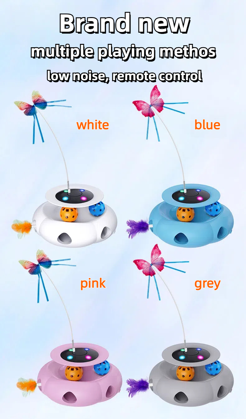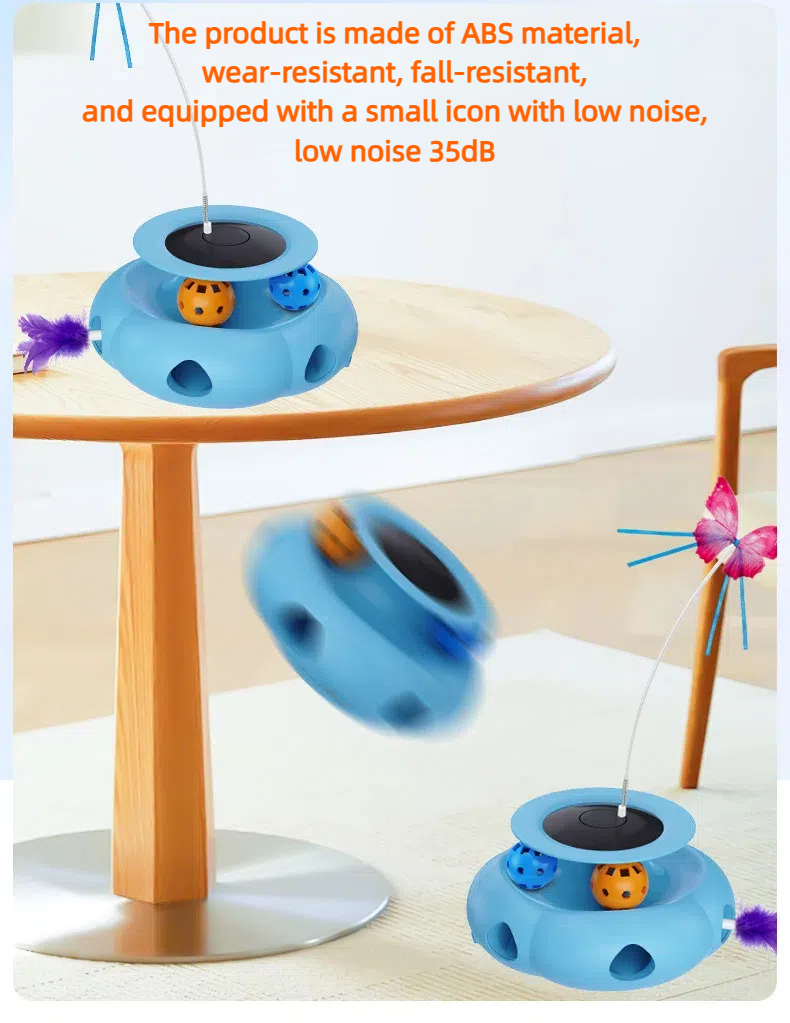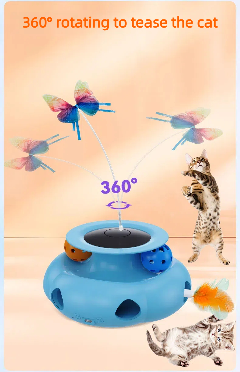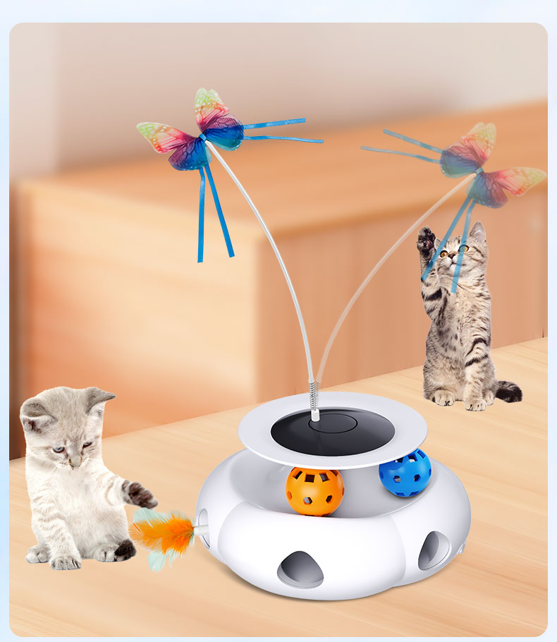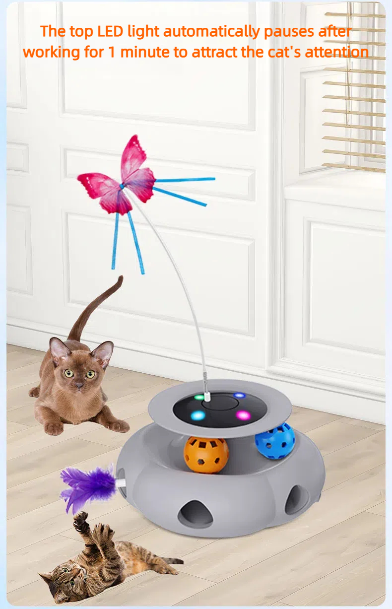 Features: Butterfly rotation + bottom feather sticking out + rotating ball three-in-one teasing cat, top with LED flashing, upgraded appearance, more preferred by cat.