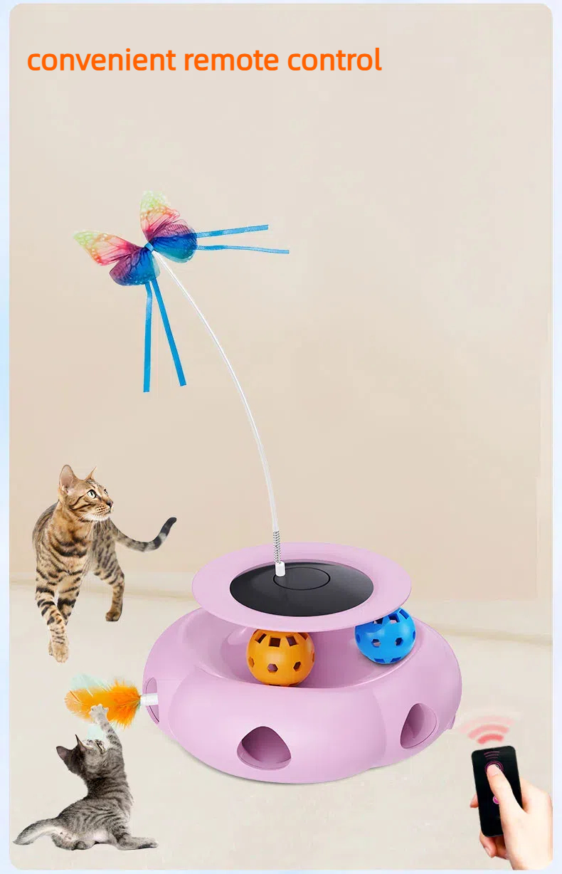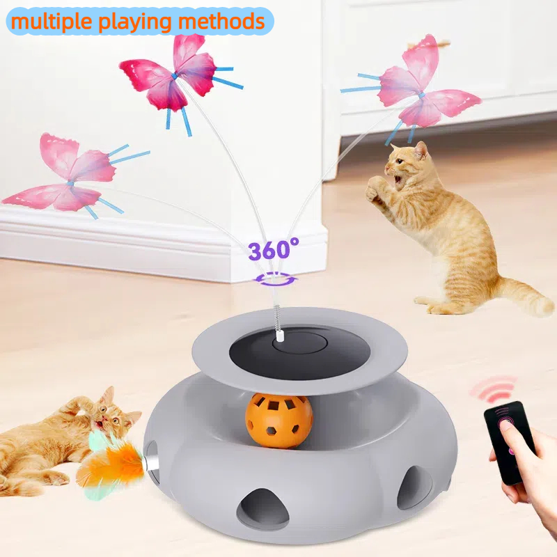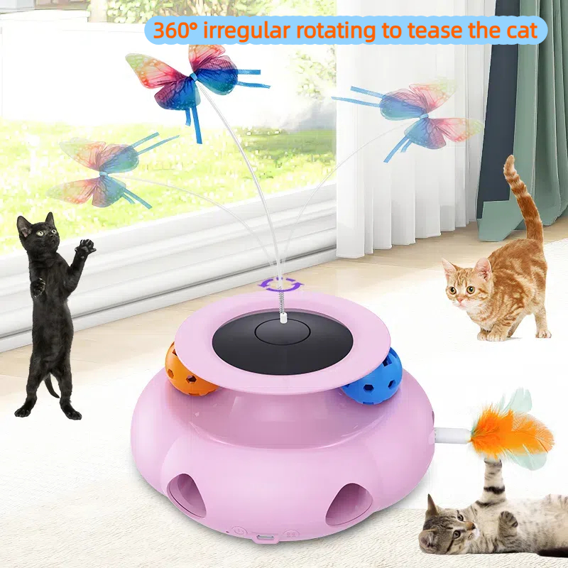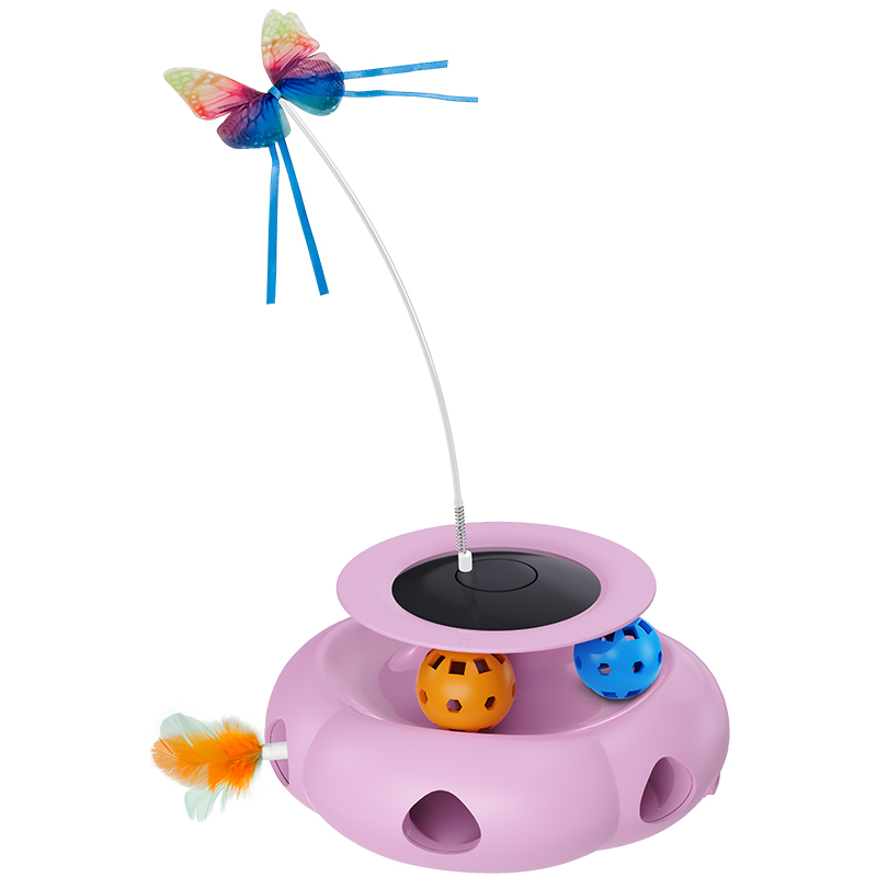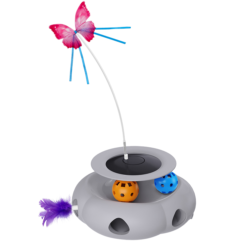 Features: Butterfly rotation + bottom feather sticking out + rotating ball three-in-one teasing cat, top with LED flashing, upgraded appearance, more preferred by cat.