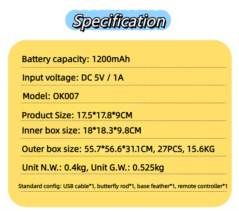 Packing list: Host *1, USB cable *1, manual *1, base feather *2, butterfly with rod *1 |