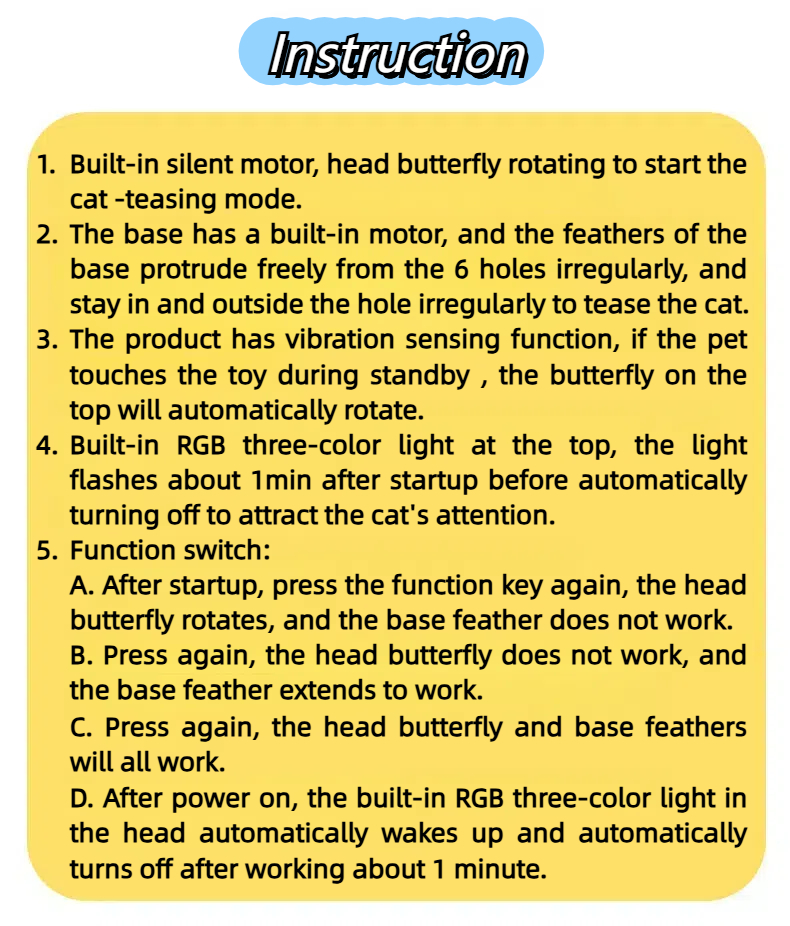 Functions: 1. After boot, the head butterfly and the bottom feather work simultaneously; short press the function key, the head butterfly rotates and the bottom feathers stops; repress, the head butterfly stops and the bottom feathers work; repress, all work again. 2. The LED light at the top flashes for 1 min every time you turn on the product to attract the cat's attention. 3. The product automatically sleeps after working for 10 minutes. Rework by touching it. Remote + manual control. |
