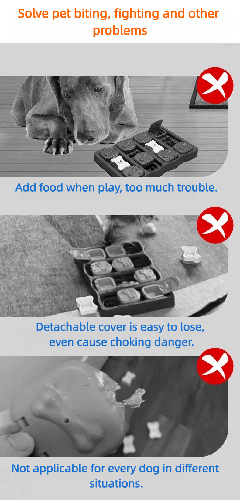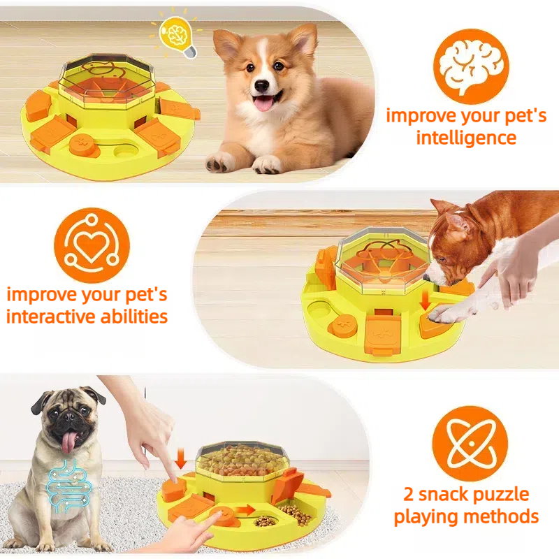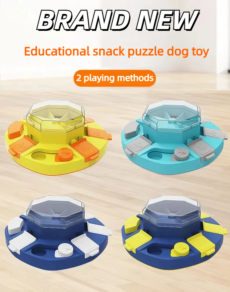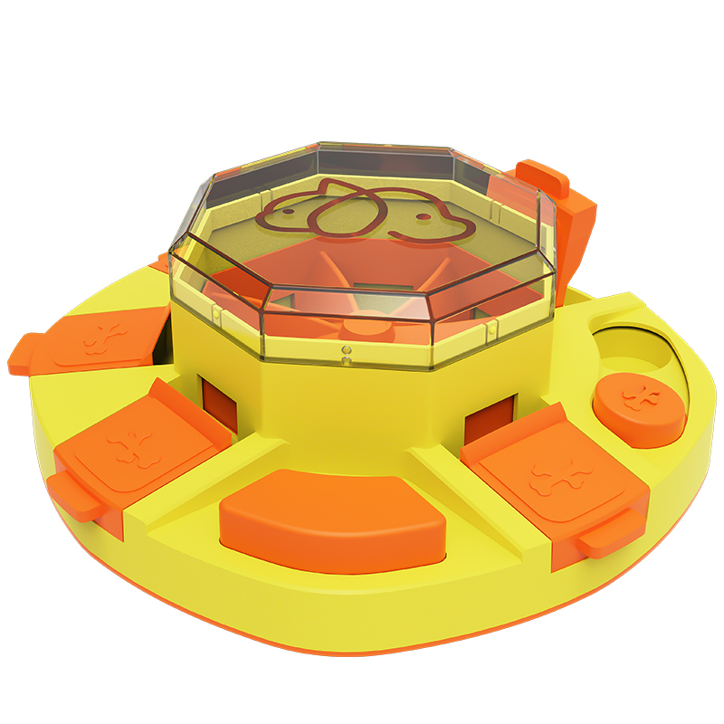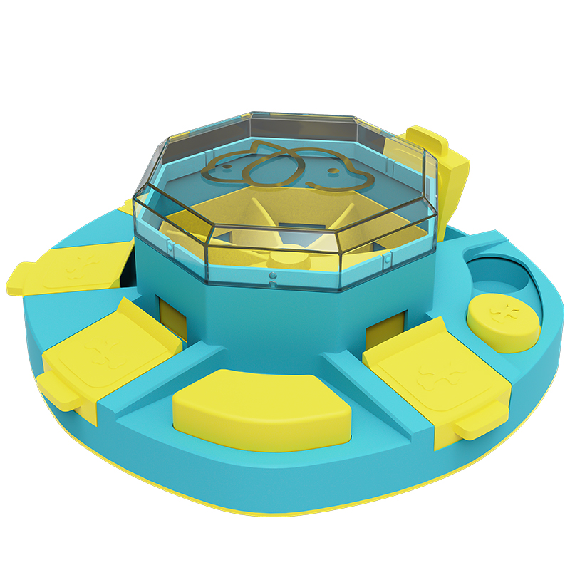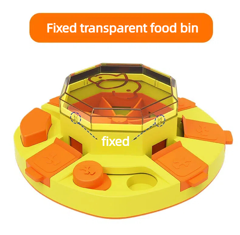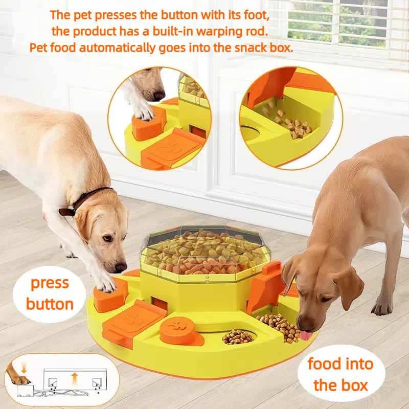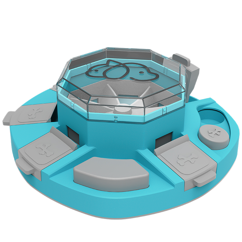 Features: 1. The product adopts the base pressing design, the food leaks into the snack box through the food channel of the grain storage bin, and the pet needs to open the snack lid to find food, which effectively develops the pet's intelligence.
