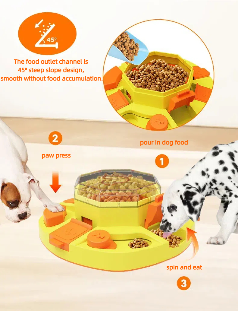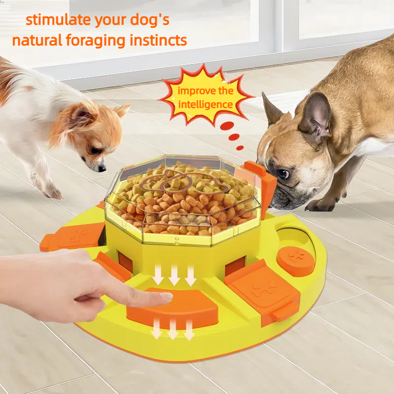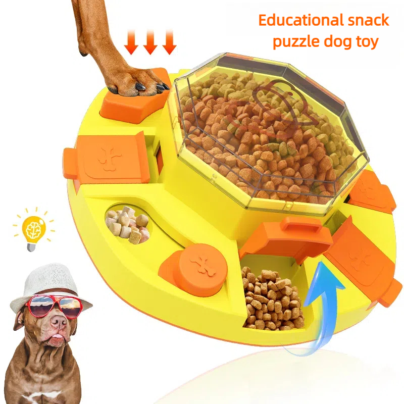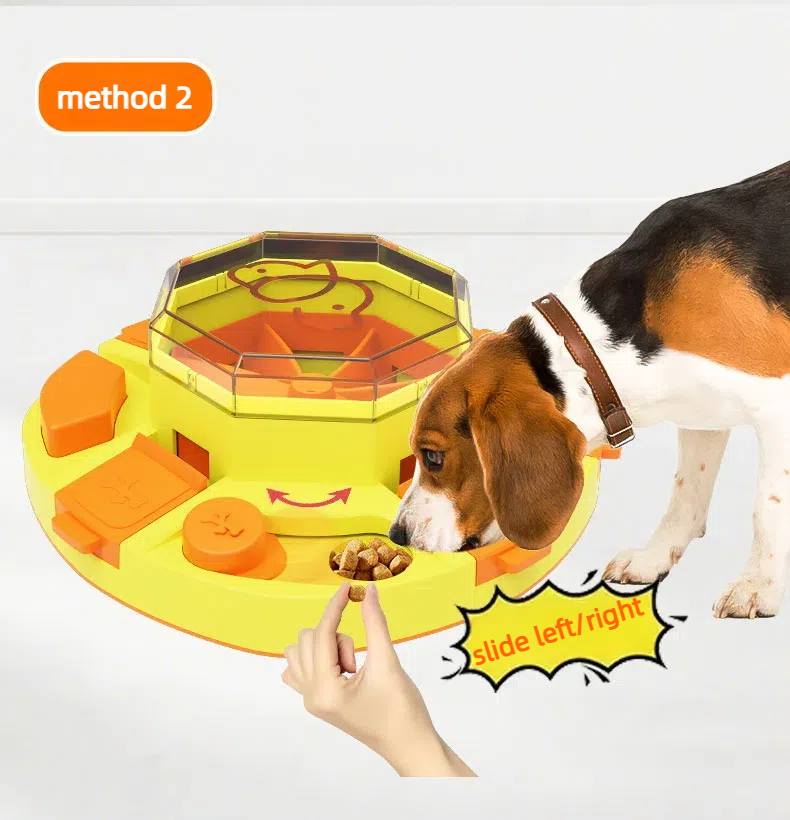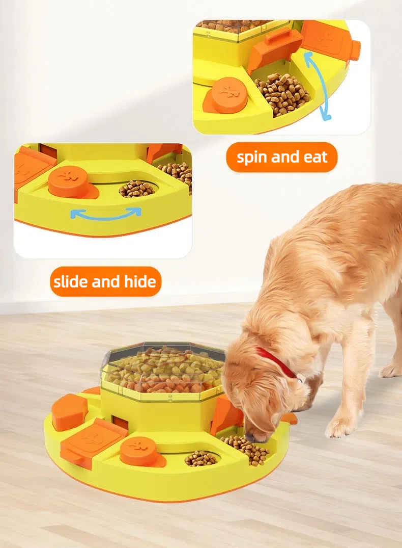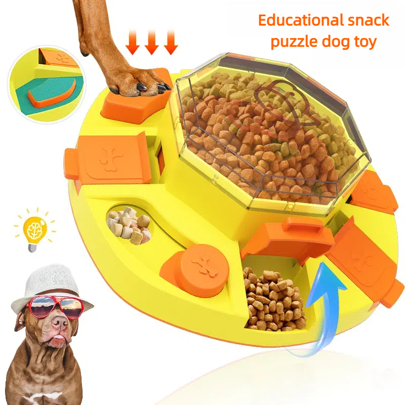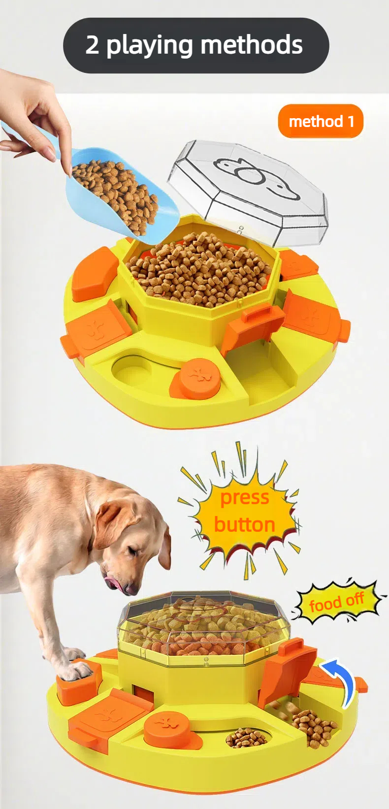 Features: 1. The product adopts the base pressing design, the food leaks into the snack box through the food channel of the grain storage bin, and the pet needs to open the snack lid to find food, which effectively develops the pet's intelligence.